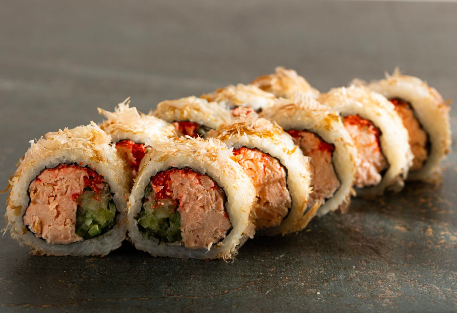 bonito, grilled salmon, cucumber, tobiko, kobe sauce