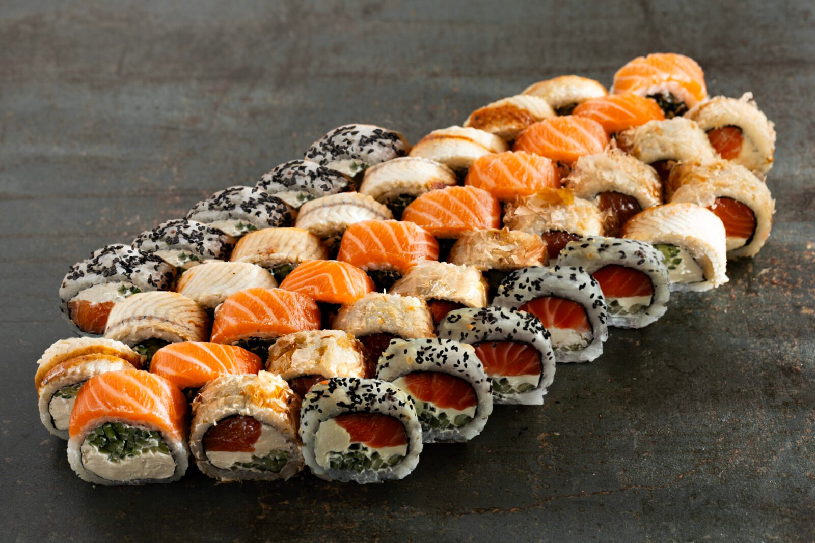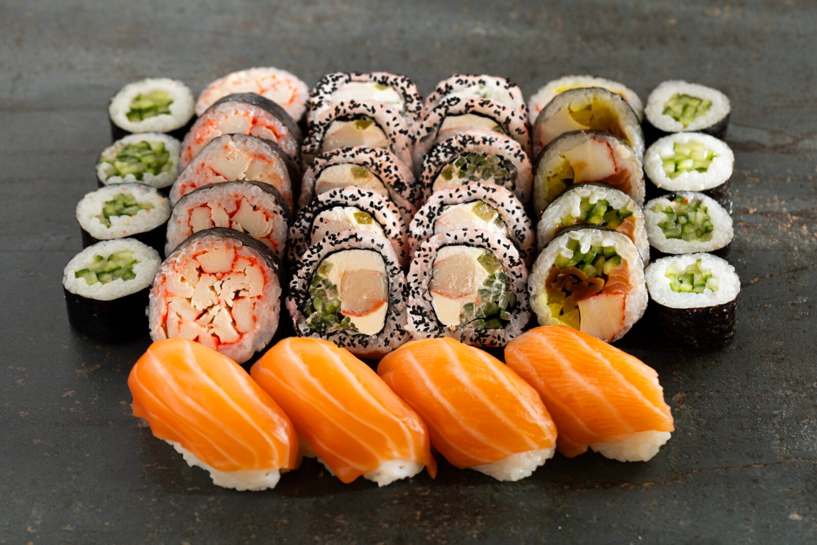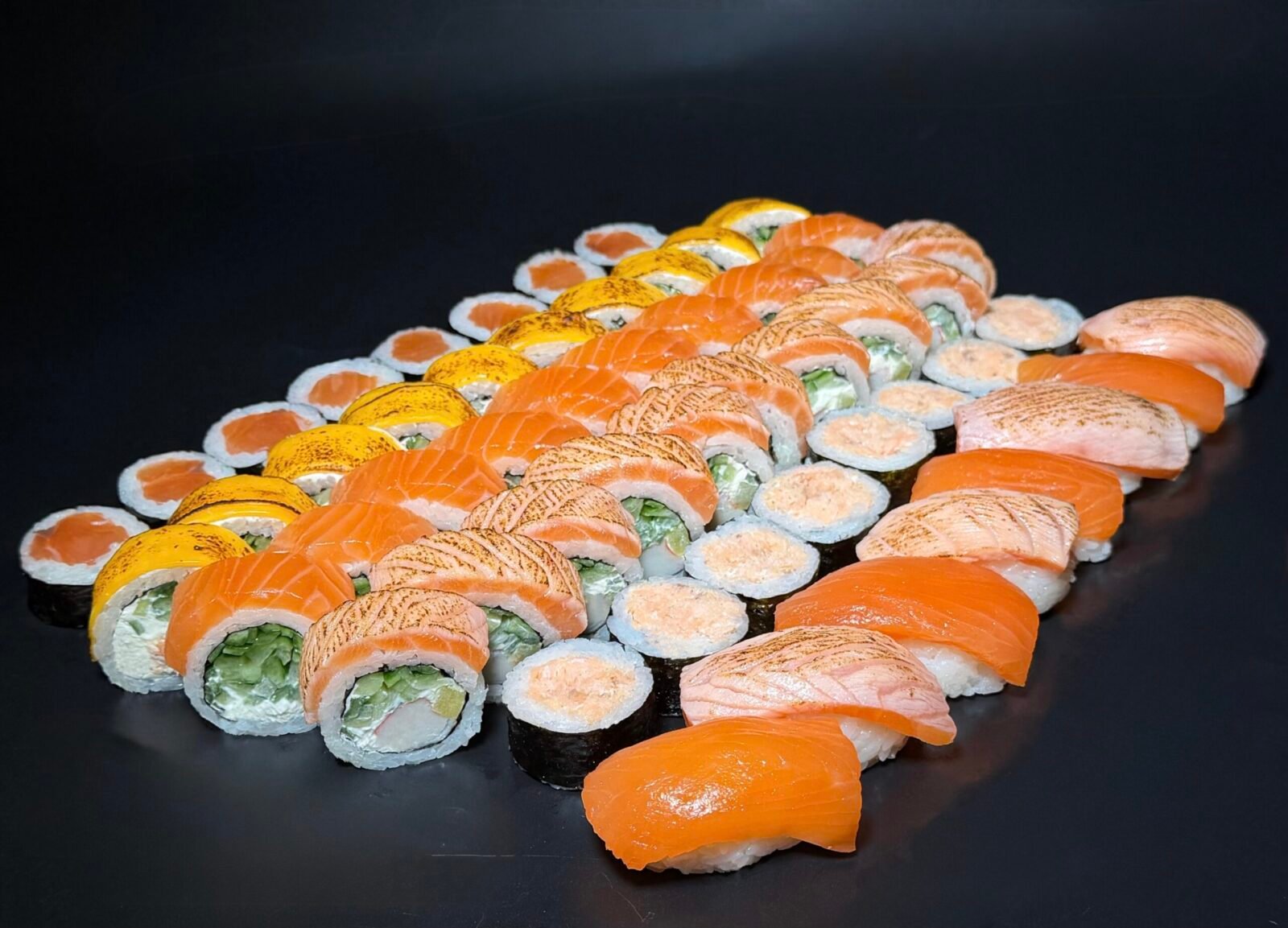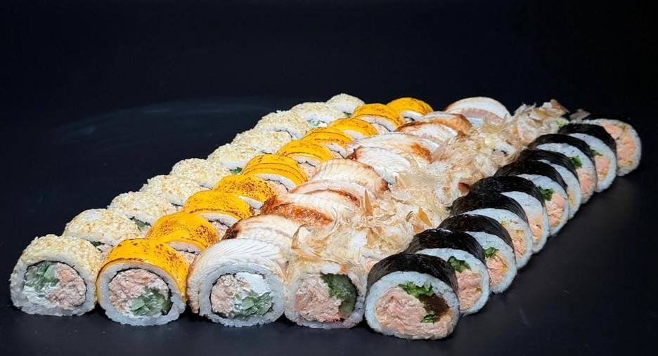 Grill Cheddar 10pcs, Philadelphia Classic 10pcs, California Gold 10pcs, Sake Maki 8pcs, Sake Grill Maki 8pcs, Nigiri Salmon 4pcs, Nigiri Fired Salmon 4pcs.