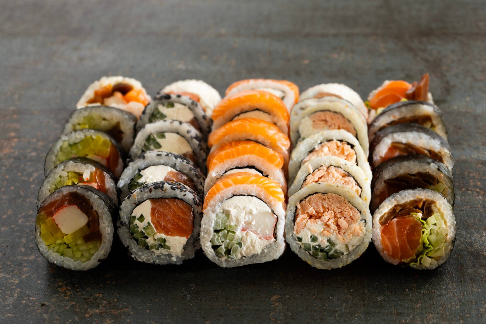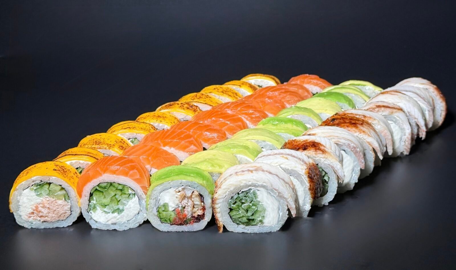 Cheddar Grill 10pc, Philadelphia Classic 10pc, Green Dragon 10pc, Eel Roll 10pc.